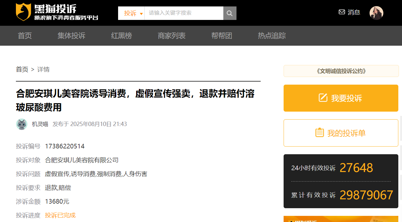 近日,据黑猫投诉平台信息,有消费者投诉合肥安琪儿美容院有限公司诱导消费,虚假宣传强卖。