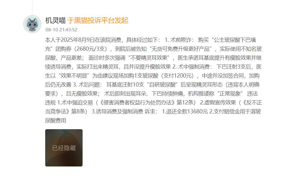 据消费者自述,2025年8月9日,其在合肥安琪儿美容院有限公司消费 购买“公主玻尿酸下巴填充”团购券(2680元/3支),到院后被告知“无货可免费升级更好产品”,实际使用不知名玻尿酸,产品更差;