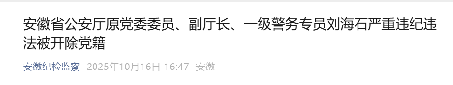 日前,经中共安徽省委批准,安徽省纪委监委对安徽省公安厅原党委委员、副厅长、一级警务专员刘海石严重违纪违法问题进行了立案审查调查。