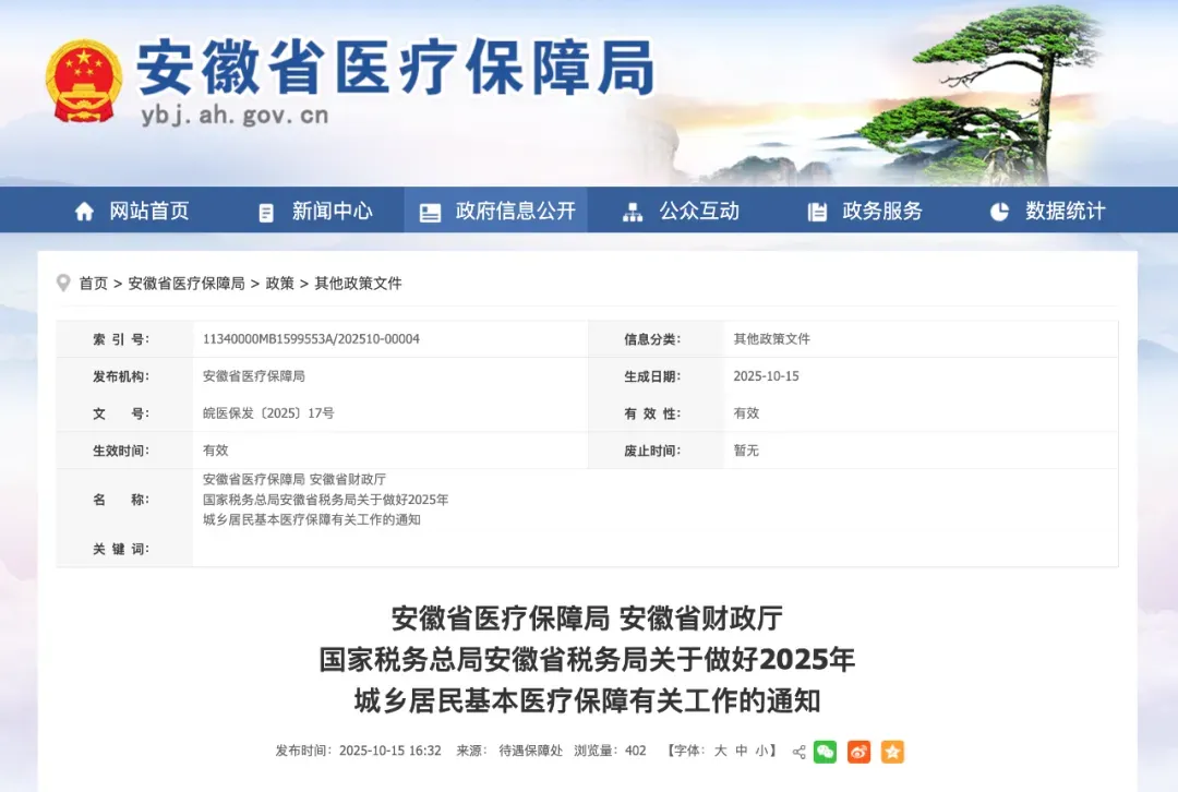 日前,安徽省医疗保障局、安徽省财政厅、国家税务总局安徽省税务局发布关于做好2025年城乡居民基本医疗保障有关工作的通知。