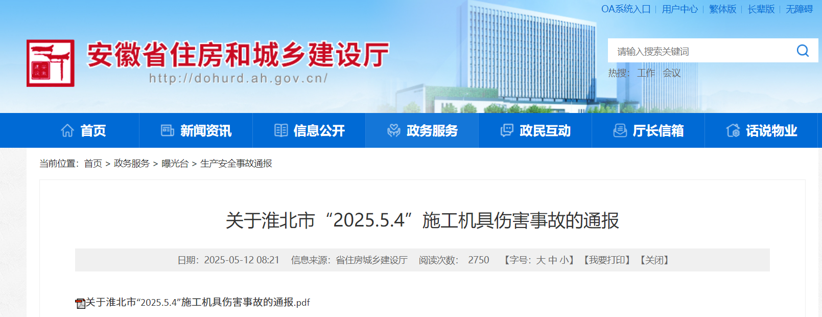 今年5月6日,安徽省住建厅公开通报淮北市“2025.5.4”施工机具伤害事故。通报信息指出,2025 年 5 月 4 日 16 时 26 分左右,淮北市烈山区城乡地表水厂净水工程及配套供水管网建设项目发生一起施工机具伤害事故,造成 1 人死亡。