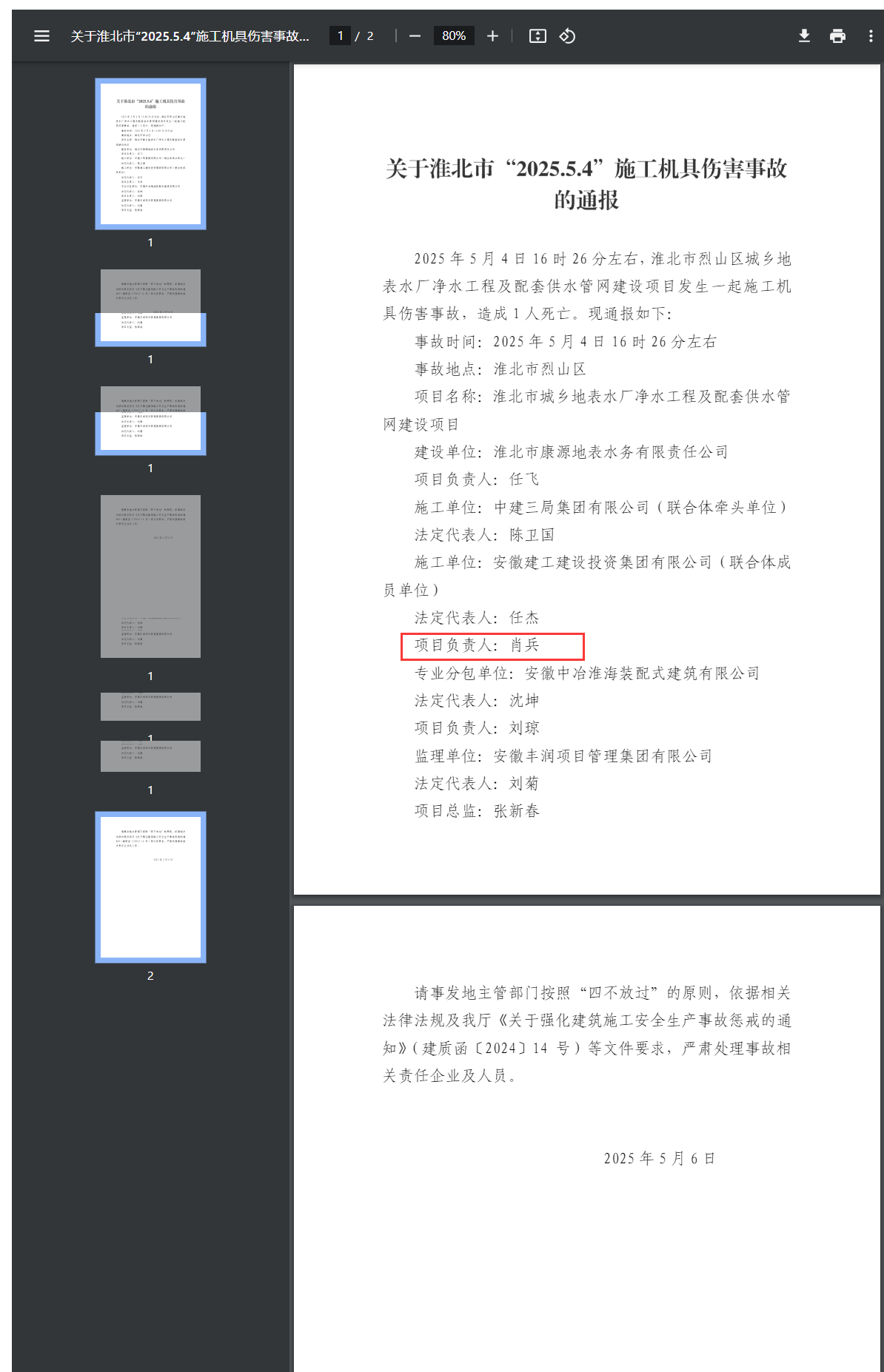 该项目建设单位为淮北市康源地表水务有限责任公司、施工单位为中建三局集团有限公司(联合体牵头单位)、安徽建工建设投资集团有限公司(联合体成员单位),被处罚的肖兵正是安徽建工建设投资集团有限公司的项目负责人。