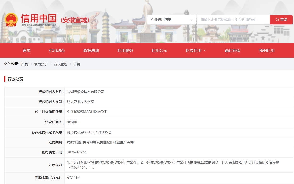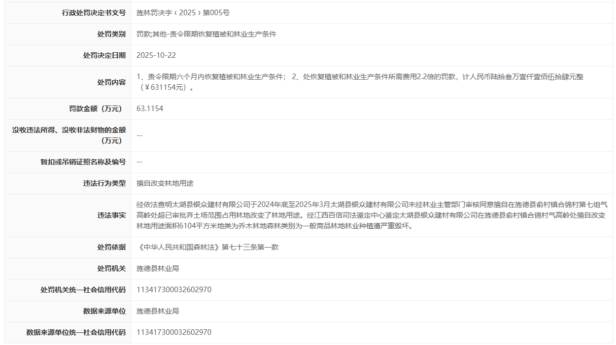 近日,信用宣城披露行政处罚信息,因擅自改变林地用途,太湖县银众建材有限公司被罚63.1154万元,行政处罚决定书文号为旌林罚决字﹝2025﹞第005号。