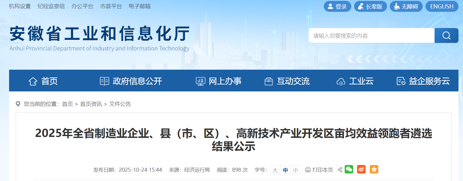 根据《2025年全省深化“亩均论英雄”改革工作要点》《2025年安徽省亩均效益领跑者行动工作方案》有关要求,遴选形成2025年全省制造业企业、县(市、区)、高新技术产业开发区亩均效益领跑者推荐名单,现予以公示。