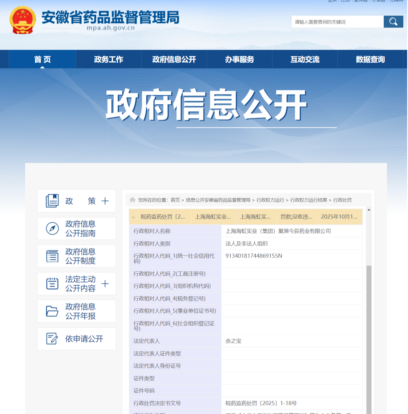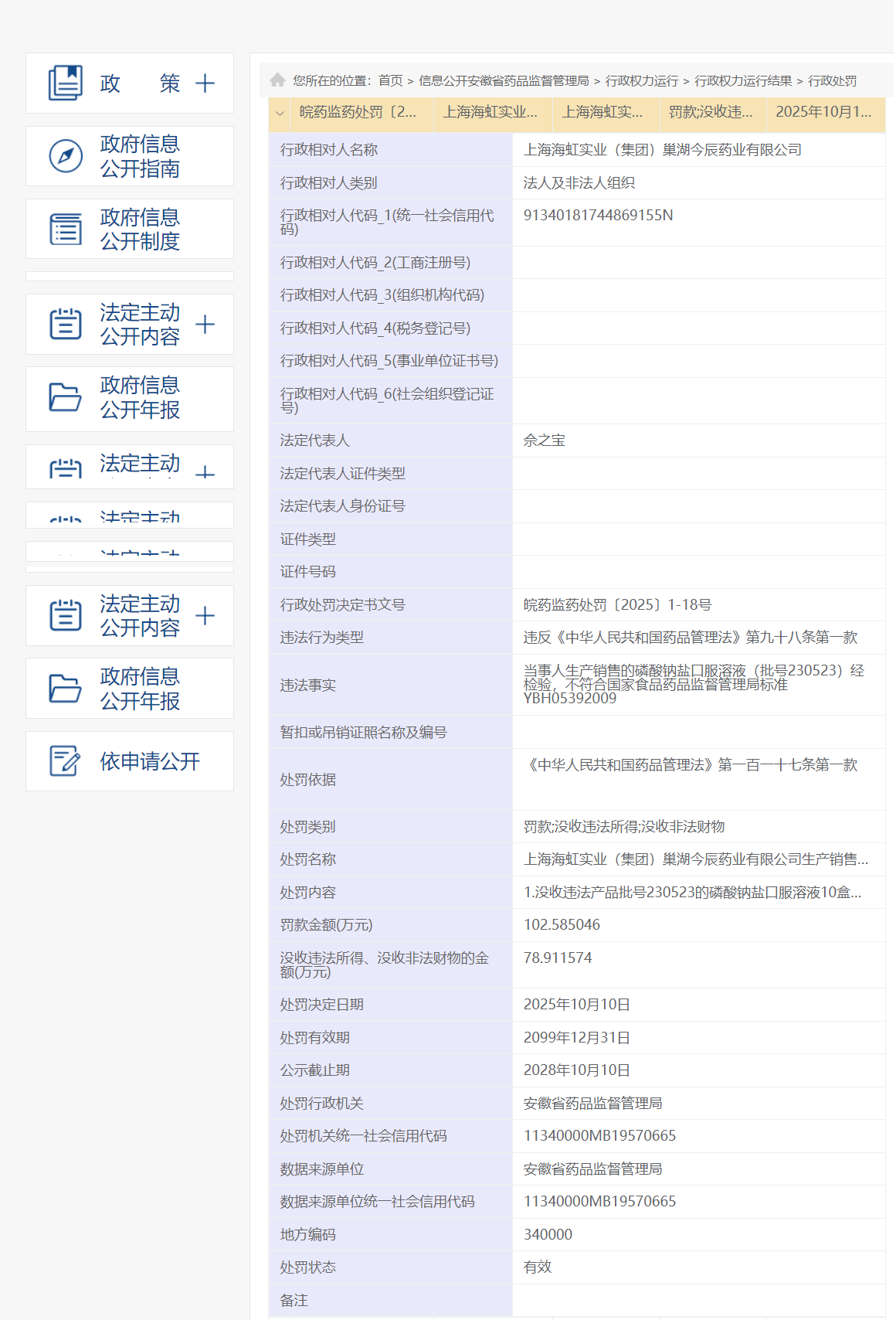 近日,安徽省药监局披露行政处罚信息,因生产销售劣药,上海海虹实业(集团)巢湖今辰药业有限公司被罚款102.585046万元,没收违法所得78.911574万元,行政处罚决定书文号为皖药监药处罚〔2025〕1-18号。