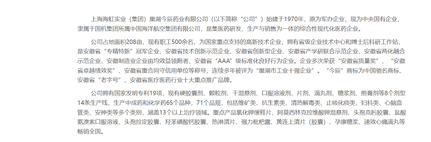 据官网信息,上海海虹实业(集团)巢湖今辰药业有限公司(以下简称“公司”)始建于1970年,原为军办企业,现为中央国有企业,隶属于国机集团所属中国海洋航空集团有限公司,是集医药研发、生产与销售为一体的综合性现代化医药企业。
