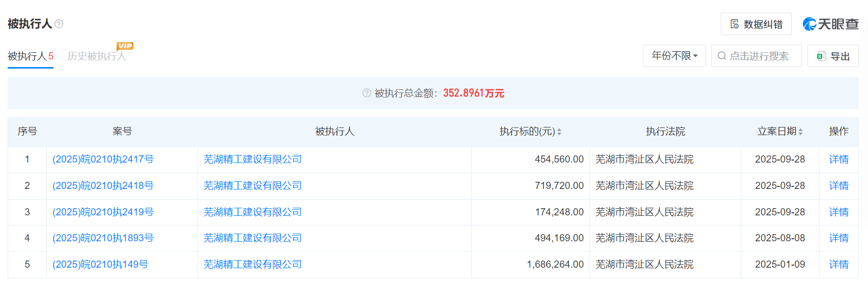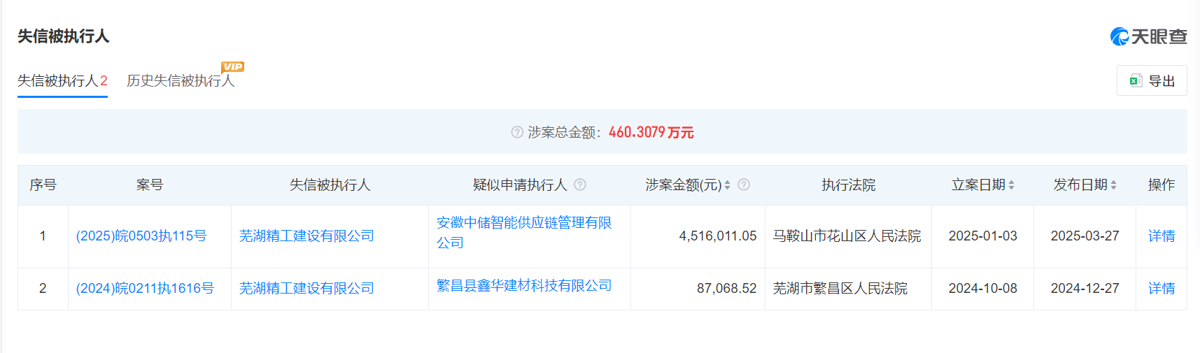 据天眼查风险信息,该公司存在一条失信被执行人信息,涉案总金额6.28万元。今年4月,该公司被芜湖市鸠江区人民法院列为被执行人,被执行总金额41万元,案号为(2025)皖0207执1316号。