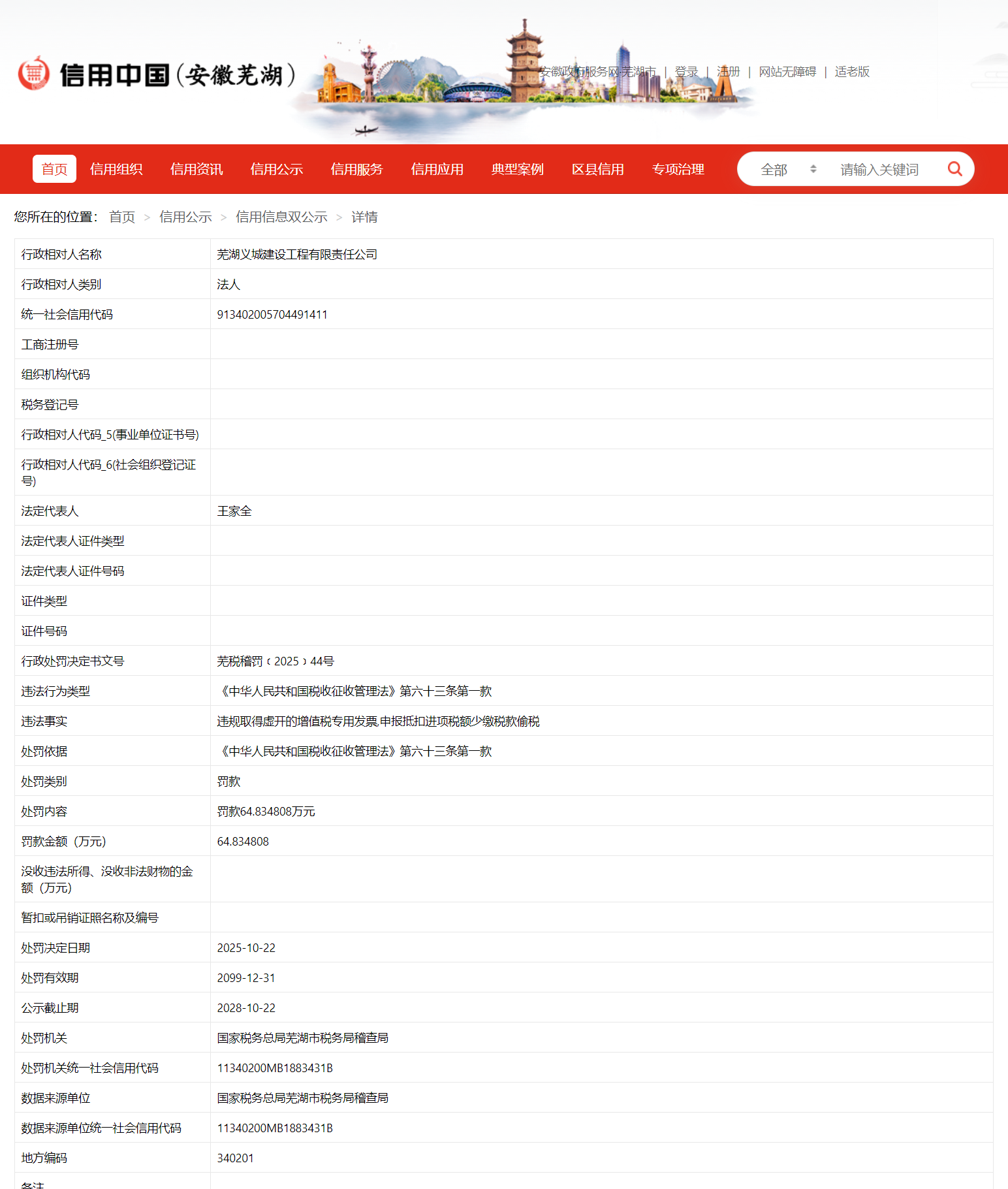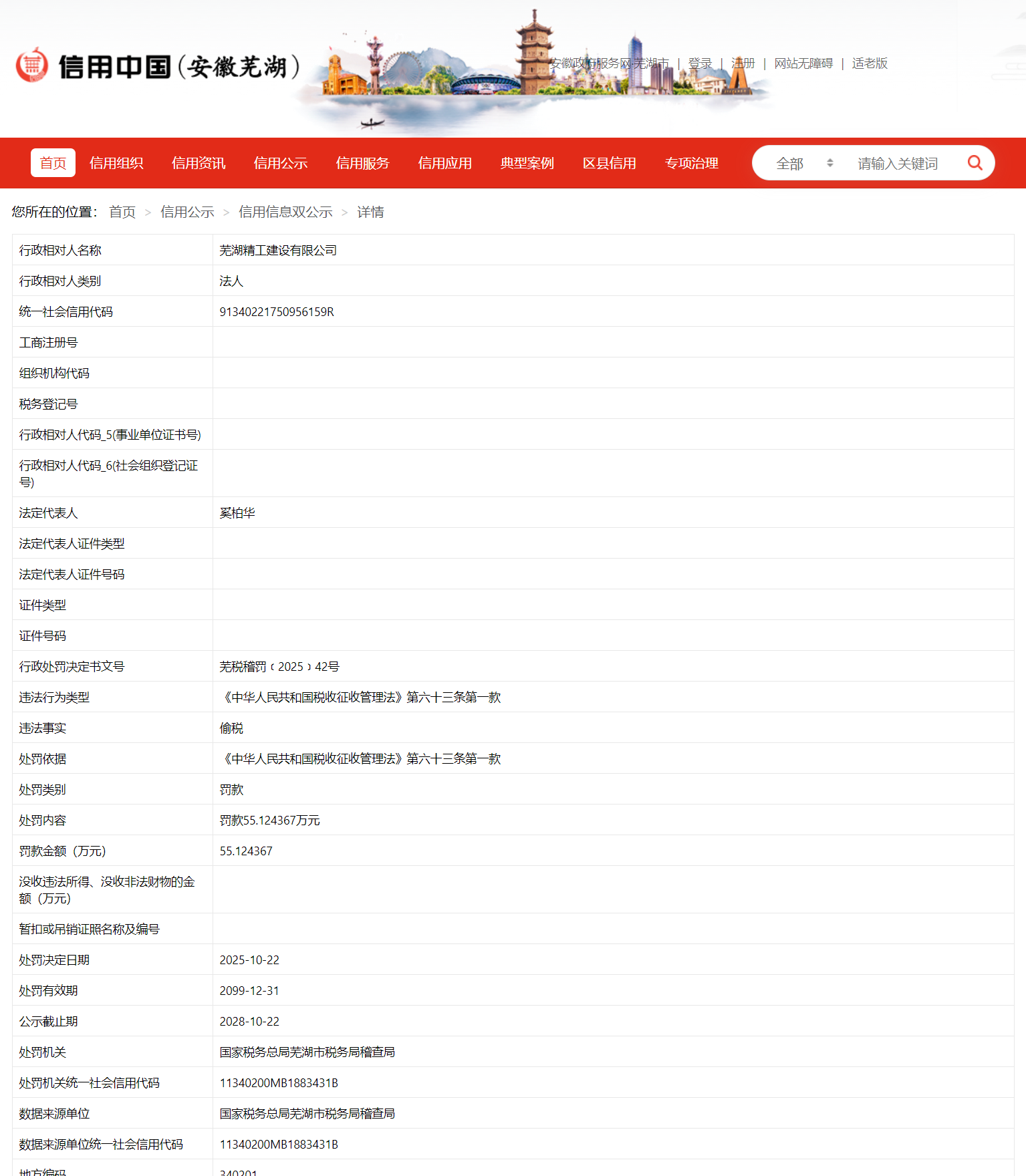 公开处罚信息显示,芜湖精工建设有限公司偷税被罚款55.124367万元,芜湖义城建设工程有限责任公司违规取得虚开的增值税专用发票,申报抵扣进项税额少缴税款偷税被罚款64.834808万元。