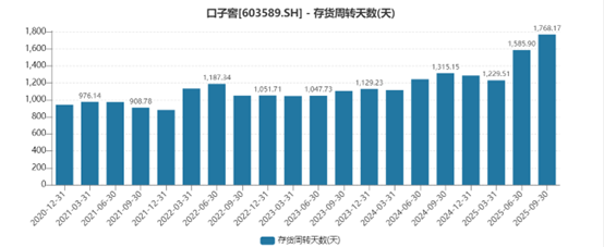 作为白酒企业的“蓄水池”,公司合同负债也来到近五年最低点3.38亿元,同比下滑4.43%。经销商拿货的积极性并不高,前两个季度分别下滑28.12%、5.95%。同时,公司存货周转天数来到1768天,再创新高。