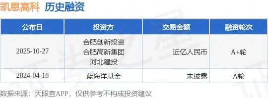 近日,天眼查APP显示,安徽凯恩高科技有限公司A+轮融资,融资额近亿人民币,参与投资的机构包括合肥创新投资,合肥高新集团,河北建投。