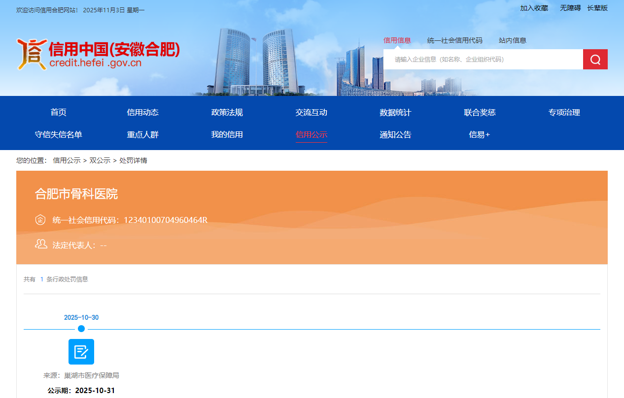 近日,信用合肥披露行政处罚信息,因过度检查、超标准收费等方面,违法违规使用医保基金,合肥市骨科医院被处罚款11.080459万元,行政处罚决定书文号为巢医保罚﹝2025﹞3号。