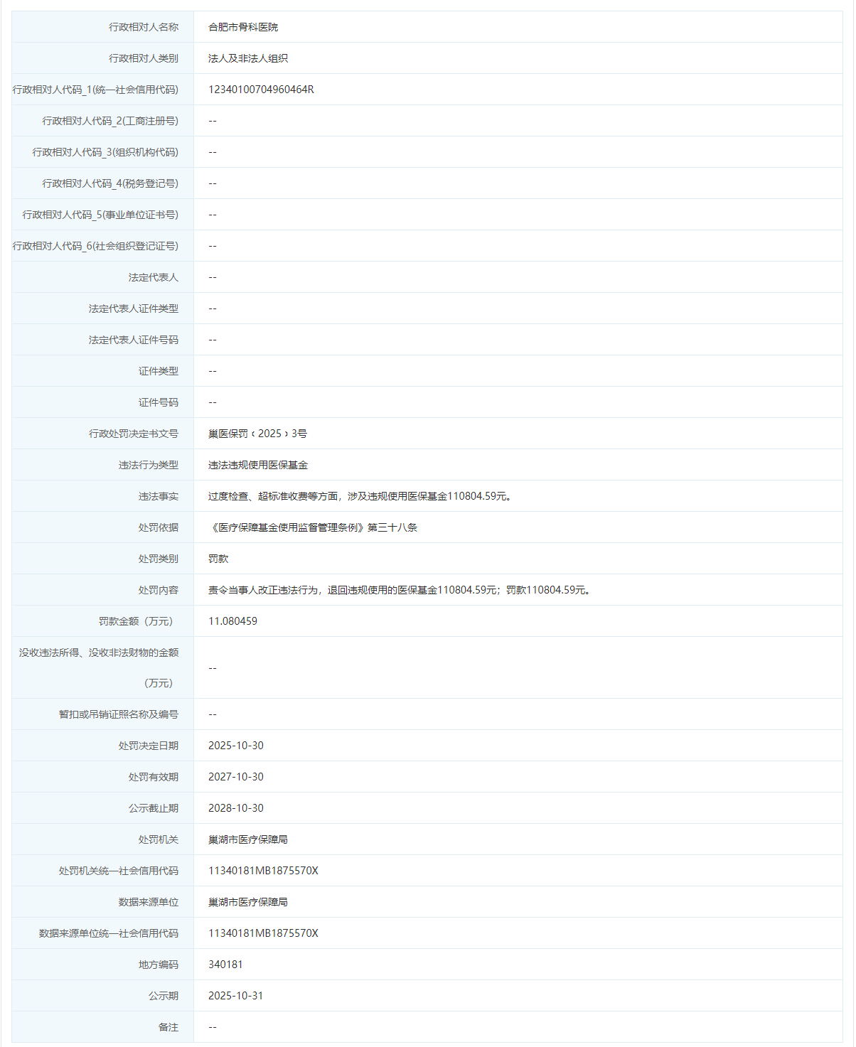 公开处罚信息显示,合肥市骨科医院过度检查、超标准收费等方面,涉及违规使用医保基金110804.59元。