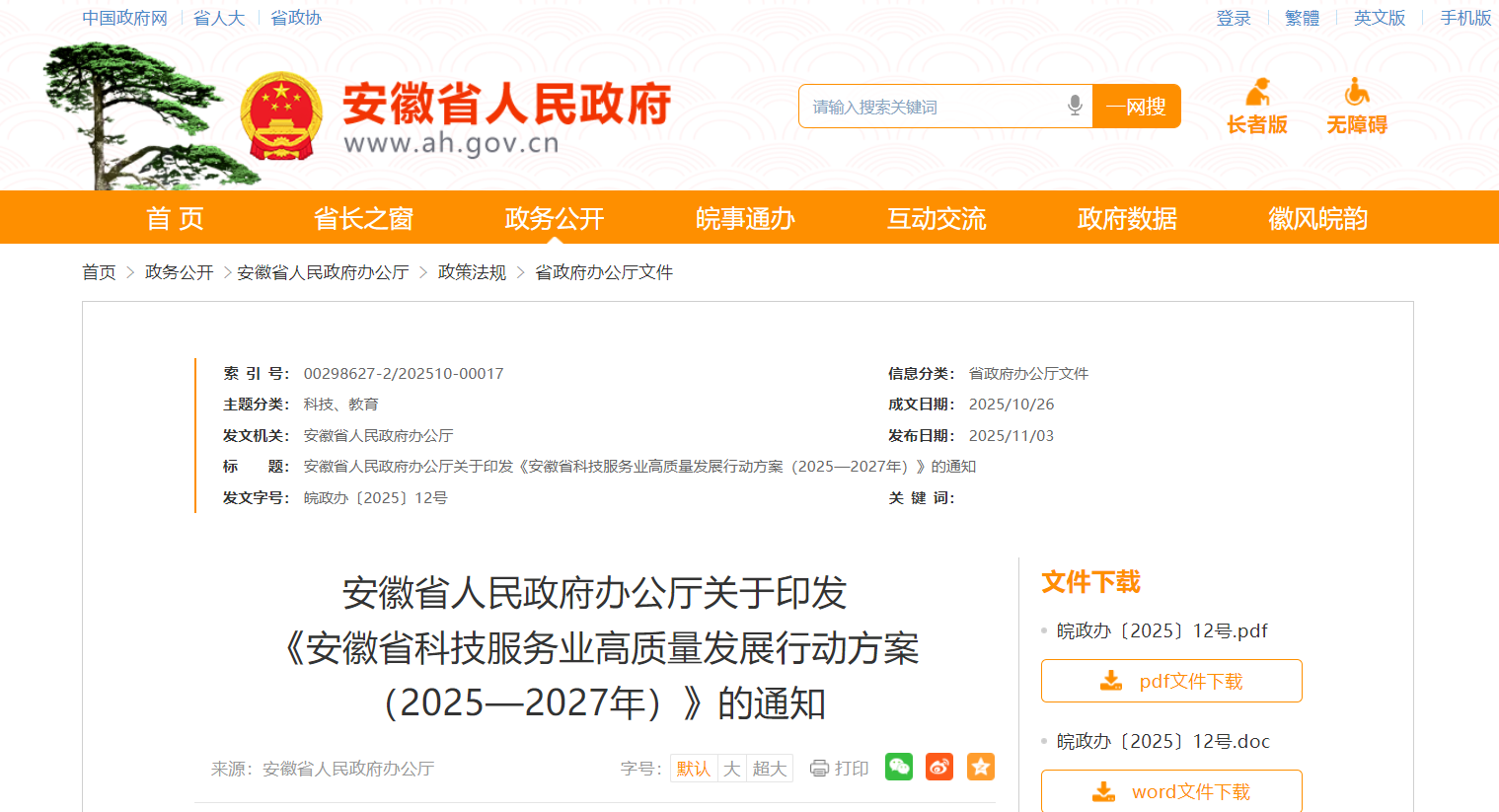 《安徽省科技服务业高质量发展行动方案(2025—2027年)》已经省政府同意,现印发给你们,请认真组织实施。
