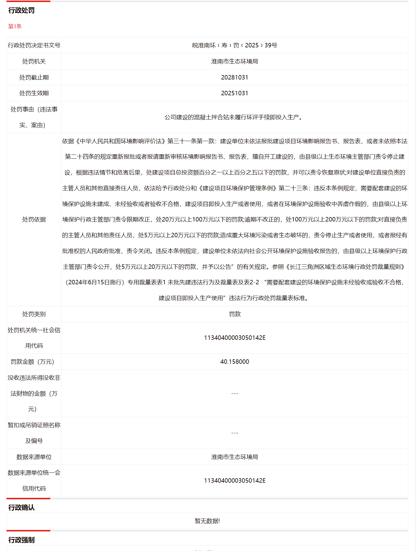 近日,信用淮南披露行政处罚信息,因公司建设的混凝土拌合站未履行环评手续即投入生产安徽北郊建设工程有限公司被罚款40.158万元,行政处罚决定书文号为皖淮南环﹝寿﹞罚﹝2025﹞39号。