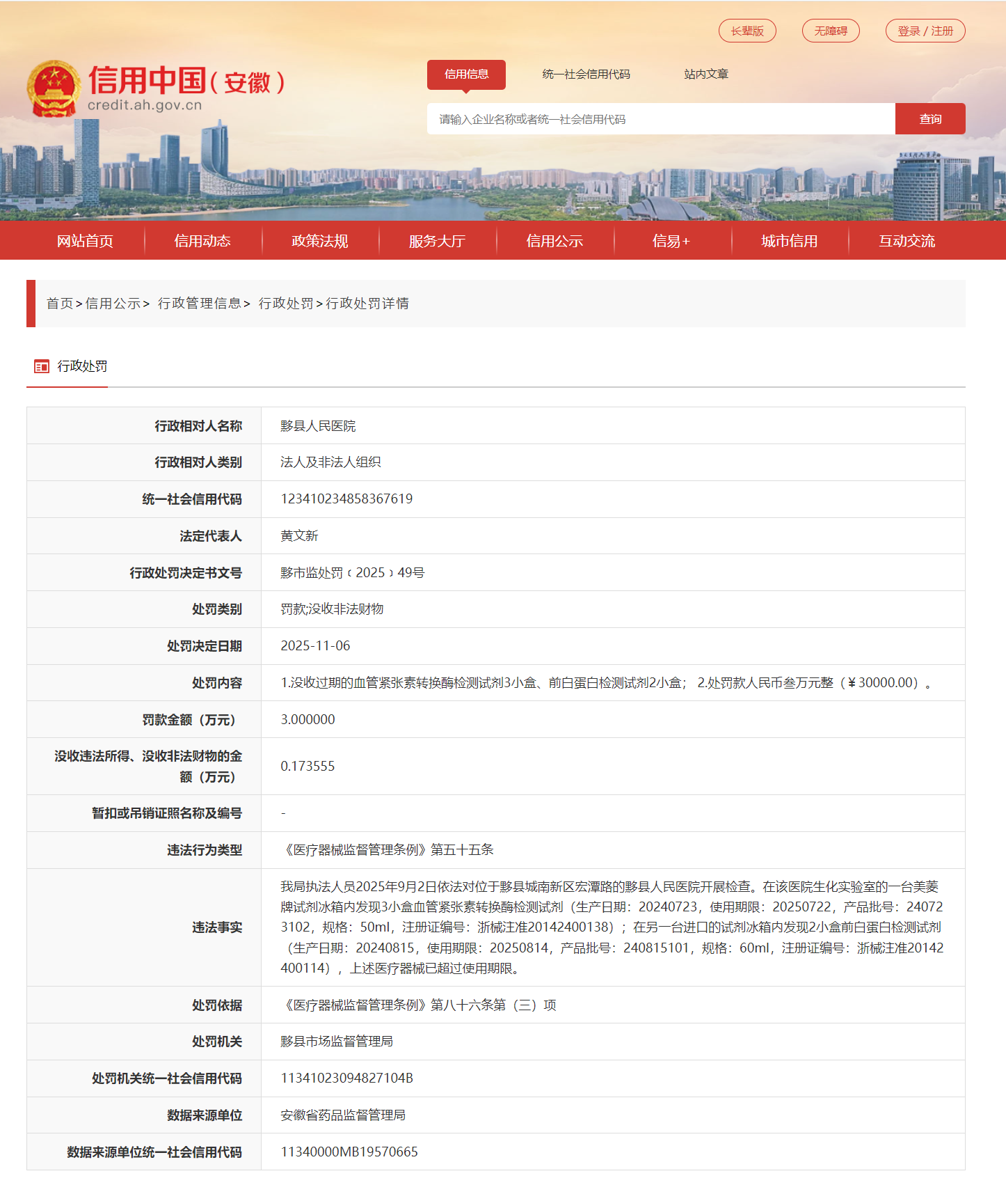 近日,信用安徽披露行政处罚信息,因使用过期医疗器械,安徽黟县人民医院被罚款3万元,行政处罚决定书文号为黟市监处罚﹝2025﹞49号。