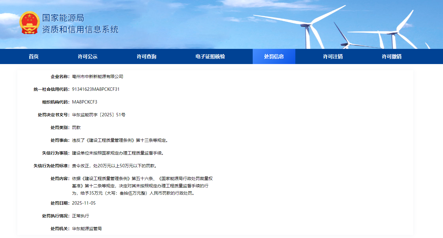 近日,华东能源监管局发布行政处罚信息,因未按照国家规定办理工程质量监督手续,亳州市中新新能源有限公司被处罚款35万元。行政处罚决定书文号为华东监能罚字〔2025〕51号。
