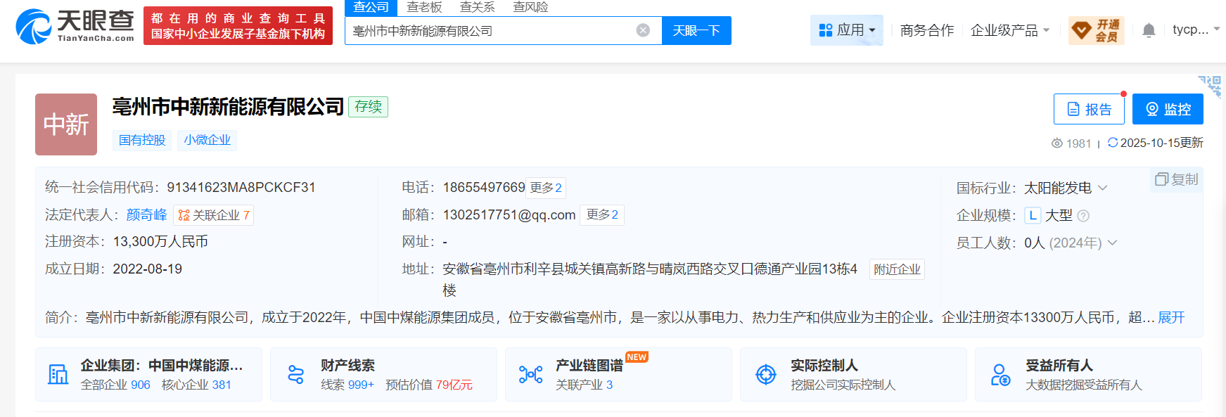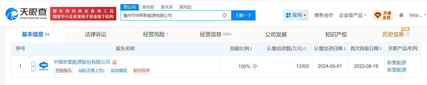 股权信息显示,该公司由中煤新集能源股份有限公司全资控股,后者系A股上市国有企业。