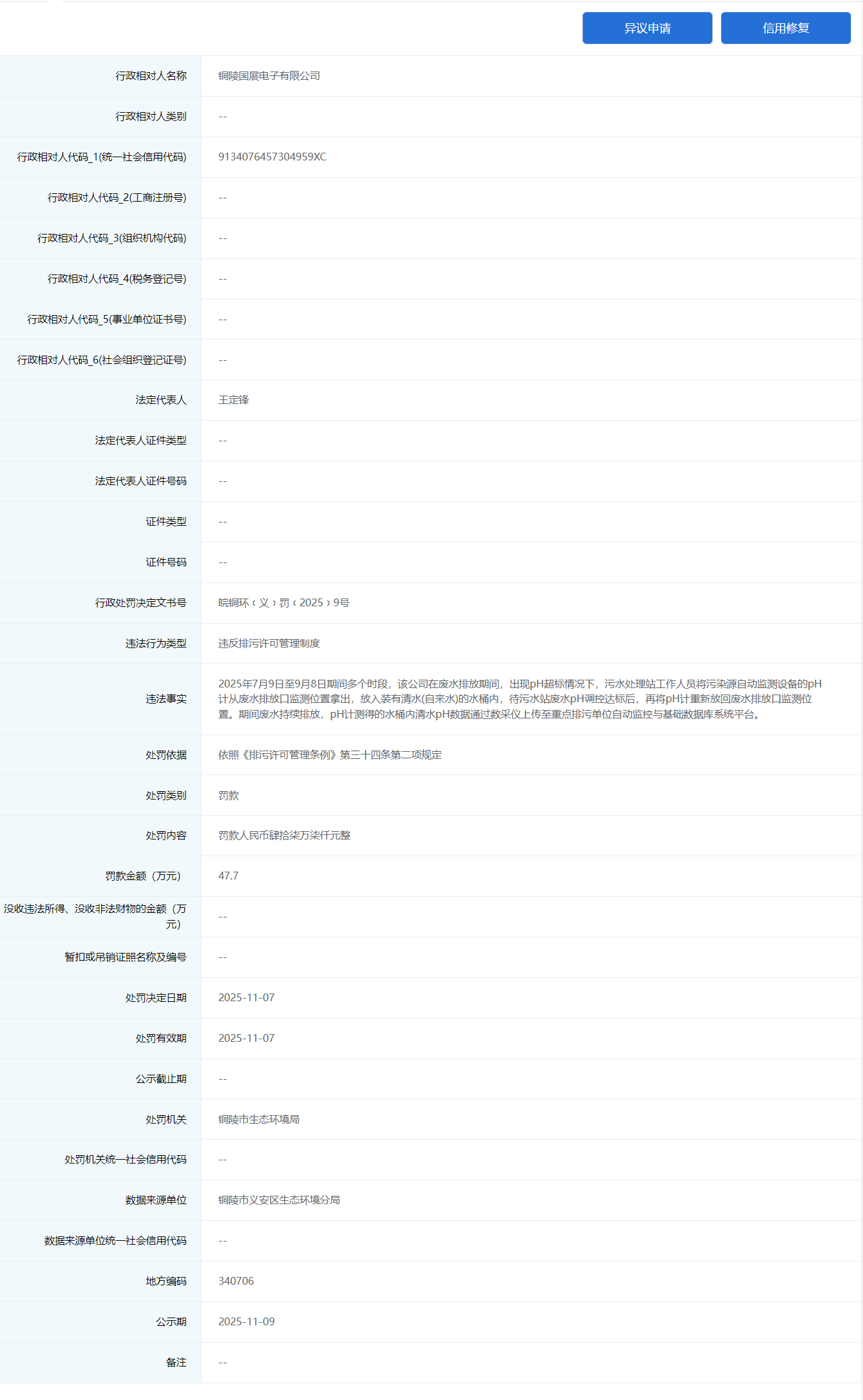 近日,信用铜陵披露行政处罚信息,因逃避监管的方式违法排放污染物,铜陵国展电子有限公司被罚款47.7元,行政处罚决定书文号为皖铜环﹝义﹞罚﹝2025﹞9号。