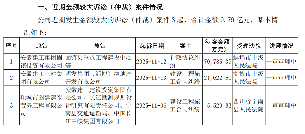 11月14日,安徽建工(600502)发布公告,为维护公司和股东利益,公司及所属子公司对欠付工程款的建设单位提起诉讼(仲裁),同时在日常生产经营过程中亦发生部分子公司作为被告或被申请人的诉讼及仲裁案件。