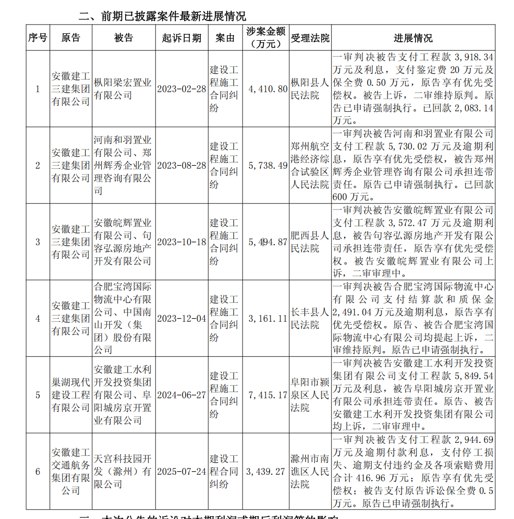 同时,公告中披露了前期案件最新进展情况,共涉及6起诉讼,其中5起安徽建工子公司作为原告,涉案金额合计22244.51万元,1起安徽建工子公司作为被告,涉案金额7415.17万元。前期案件中,2起案件二审再审,4起申请强制执行。