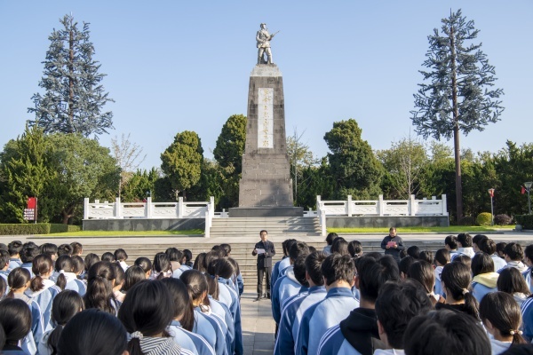 活动核心环节,陈学峰校长在革命烈士纪念碑前发表致辞,以陵园为课堂、以历史为教材,为全体学生讲授了一堂深刻的“行走的思政课”。“我们脚下的这片土地,曾是烽火连天的抗日前线,曾是浴血奋战的革命战场,长眠于此的每一位先烈,都用生命守护了家国、换来了今日的安宁与发展。”陈校长开篇便将学生的思绪带回那段波澜壮阔的岁月,引导大家思考从半塔硝烟到如今安宁生活背后,贯穿始终的艰苦奋斗、矢志不渝的精神主线。