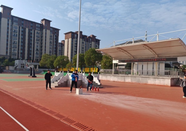 全体师生安全撤离到指定集结区域后,各班迅速清点并上报人数。随后,中专部23汽车班的周新江、汪标同学为师生们现场演示了干粉灭火器的正确使用方法,强调了“提、拔、握、压”的操作口诀。通过实际操作的展示,大家进一步巩固了灭火技能,提升了面对火情时的实战勇气和处置能力。