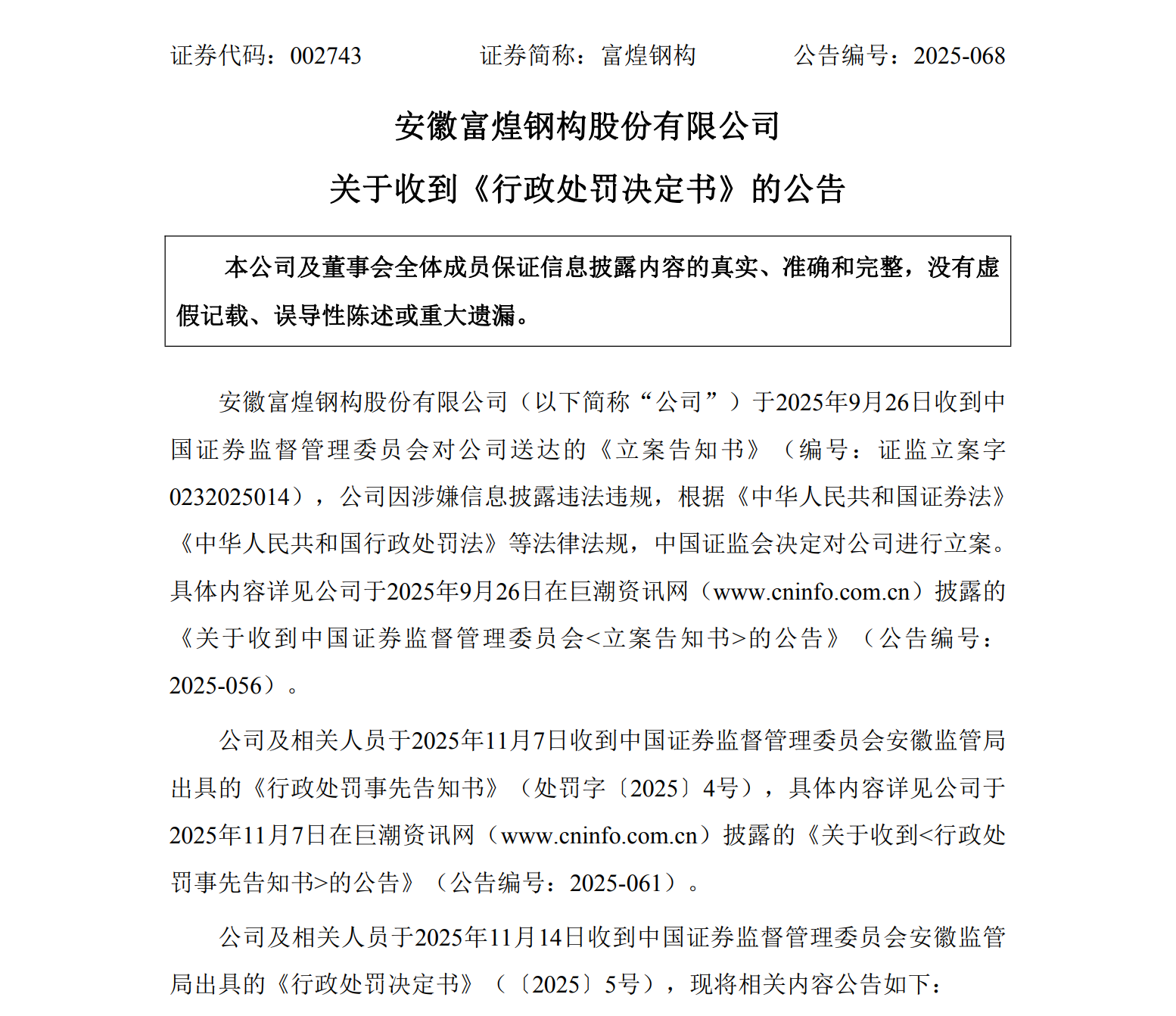 11月14日,富煌钢构(002743)发布公告,收到中国证券监督管理委员会出具的《行政处罚决定书》。