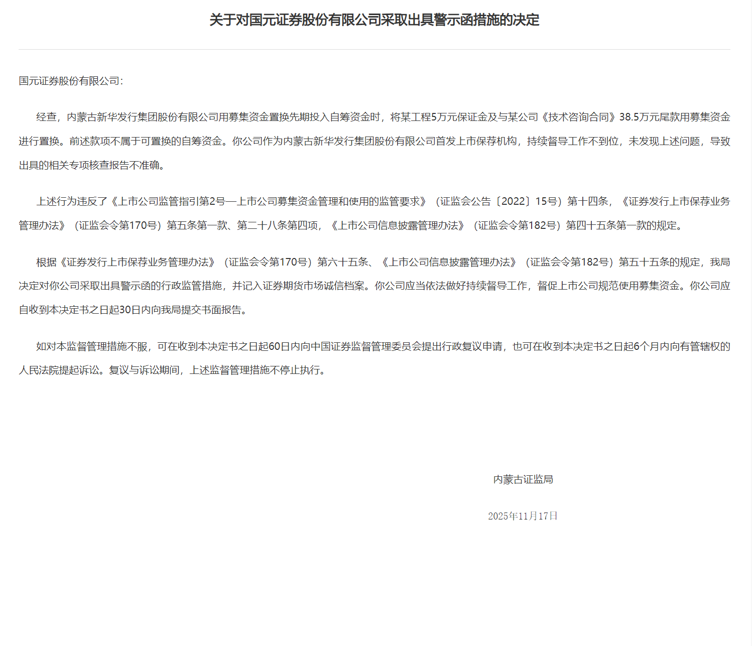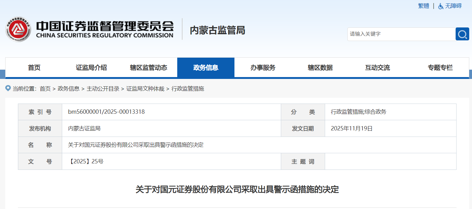 近日,内蒙古证监局披露行政监管措施信息,国元证券股份有限公司(简称“国元证券”)被出具警示函。