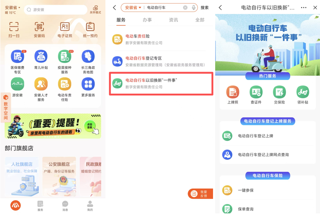 下载“皖事通”APP并注册登录,搜索“电动自行车”,点击“电动自行车以旧换新‘一件事’”进入。