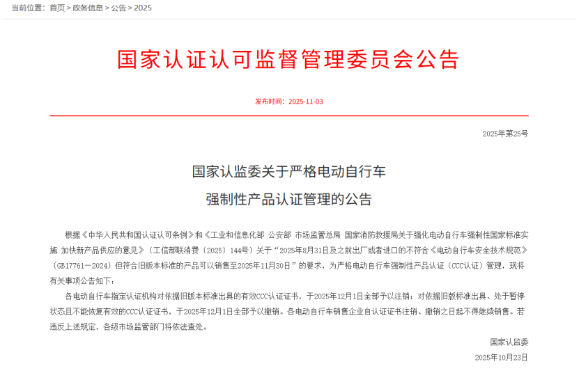 公告指出,各电动自行车指定认证机构对依据旧版本标准出具的有效CCC认证证书,于2025年12月1日全部予以注销;对依据旧版标准出具、处于暂停状态且不能恢复有效的CCC认证证书,于2025年12月1日全部予以撤销。各电动自行车销售企业自认证证书注销、撤销之日起不得继续销售。