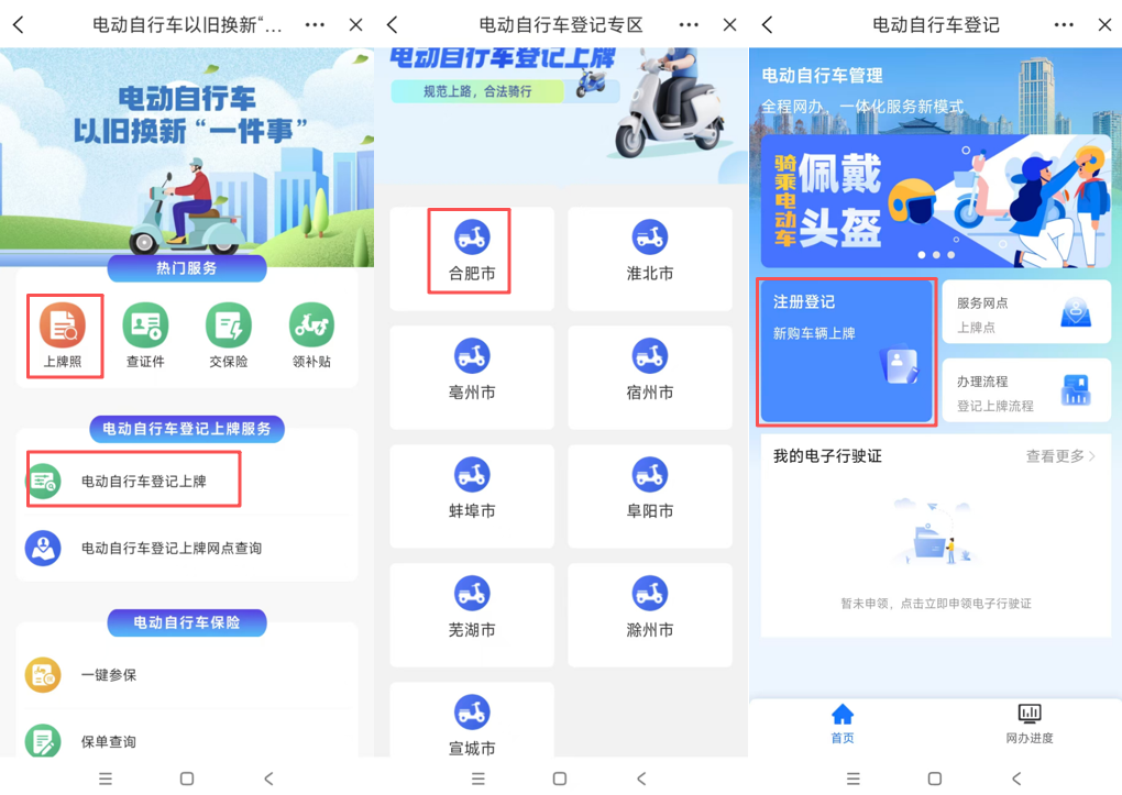 在服务页面点击“上牌照”或“电动自行车登记上牌”,进入电动自行车登记专题,选择所在城市(这里以合肥为例),点击“注册登记”按照页面提示操作即可完成登记上牌。