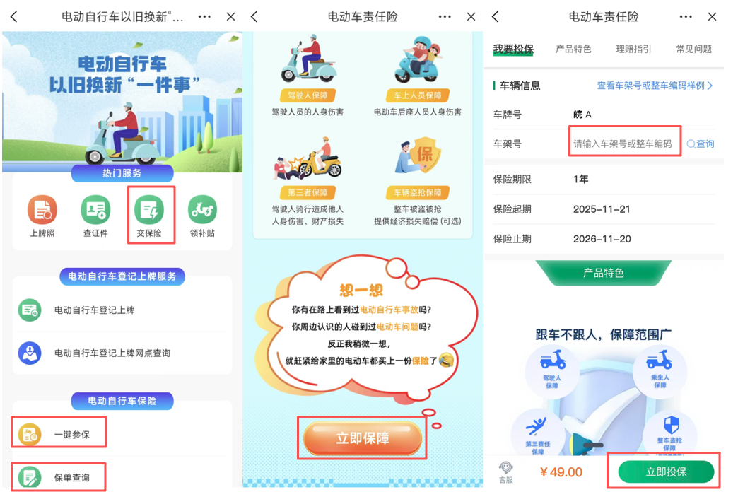 在服务页面点击“交保险”或“一键参保”,可根据需求为自己或他人购买电动车责任险。参保之后,可通过“保单查询”服务,查询保单信息。