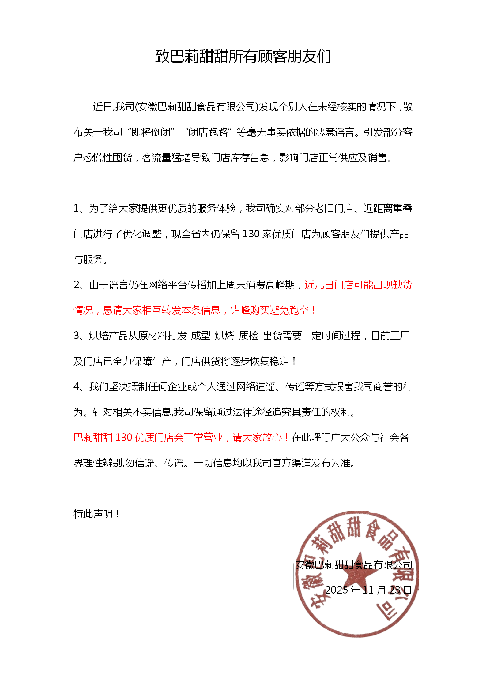 近日,我司(安徽巴莉甜甜食品有限公司)发现个别人在未经核实的情况下,散布关于我司“即将倒闭〞“闭店跑路〞等毫无事实依据的恶意谣言。引发部分客户恐慌性囤货,客流量猛增导致门店库存告急,影响门店正常供应及销售。