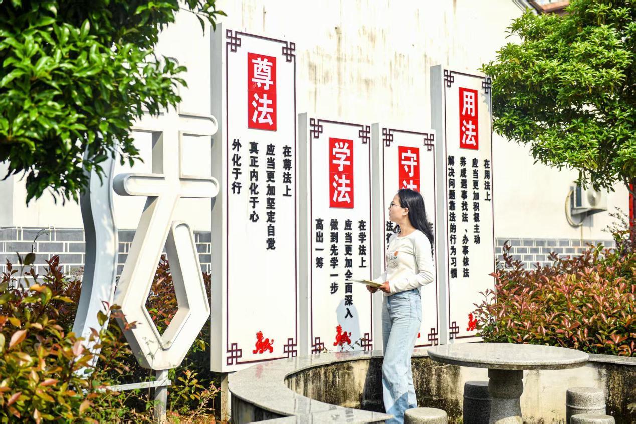 今年初,随着白泥中心村省级和美乡村示范点建设工程的完工,一座宽10—50米,长300余米的“滨河休闲公园+法治文化广场”也脱颖而出。园中依托原有资源打造了古树群景点、古桥景观,修建了休闲步道、观光凉亭、旅游公厕、绿化草坪、户外村史馆等设施。同时聚焦法治文化广场建设,建起了广场标识牌,法治文化墙,法治谚语、漫画、故事牌等设施,融法治元素与传统文化元素为一体,营造出了浓厚的法治文化氛围,旨在丰富法治文化阵地,深入推进基层依法治理,加强法治乡村建设。