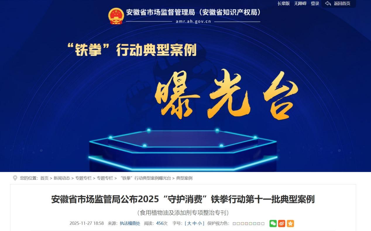 为保障人民群众食品安全,重点打击生产销售食用植物油及添加剂过程中出现的违法行为,保障人民群众“舌尖上的安全”,2025年,安徽省市场监管局在全省范围内开展了食用植物油及添加剂专项整治行动。现将部分食品执法典型案例公布如下: