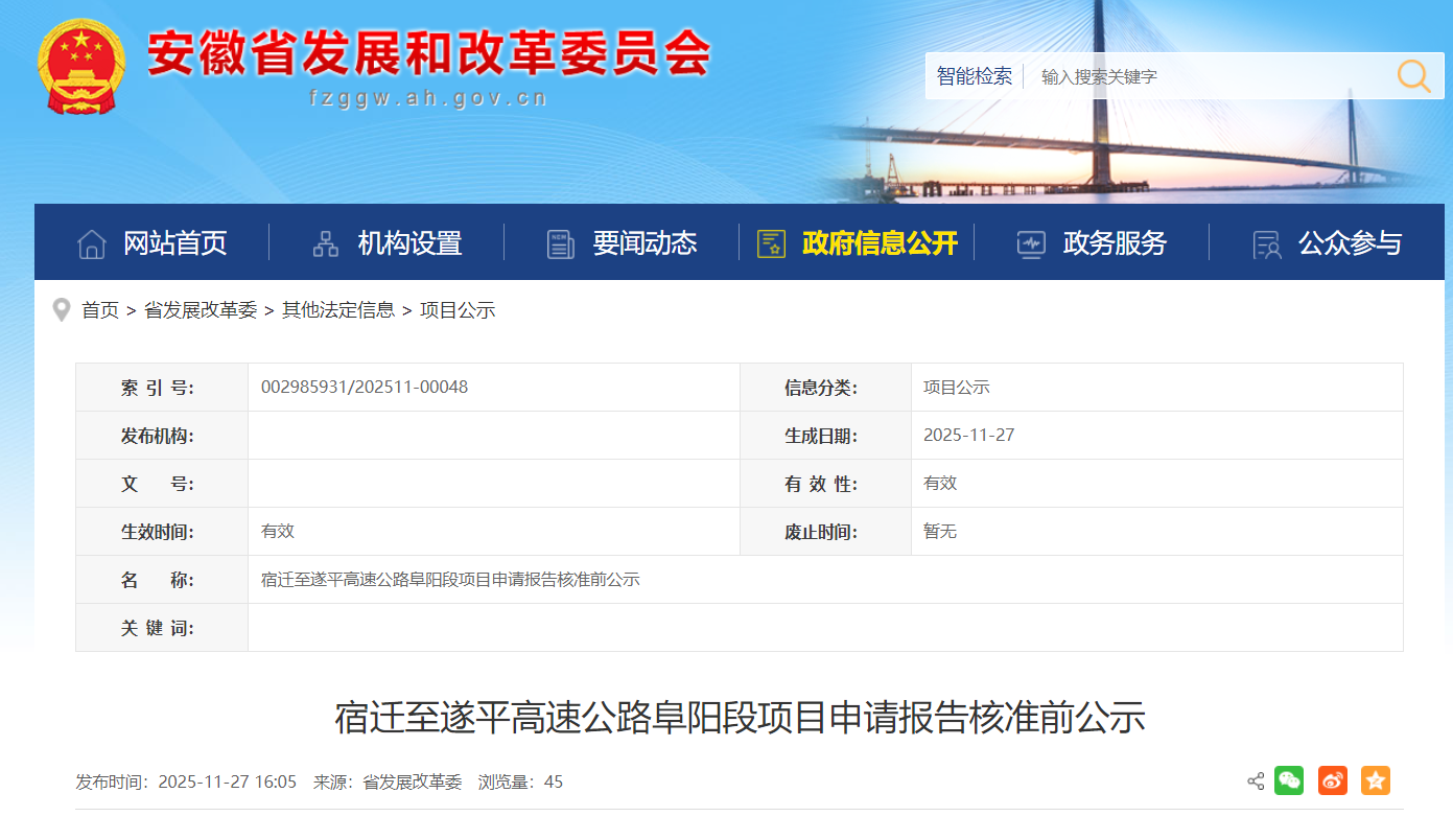 现将宿迁至遂平高速公路阜阳段项目申请报告核准内容予以公示。公示时间自公示之日起5个工作日(11月27日—12月3日),如有意见和建议,请以来人或署名来信(包括电子信函)方式向省发展改革委基础设施发展处反映,并提供姓名及联系电话,对匿名方式提出异议的不予受理。