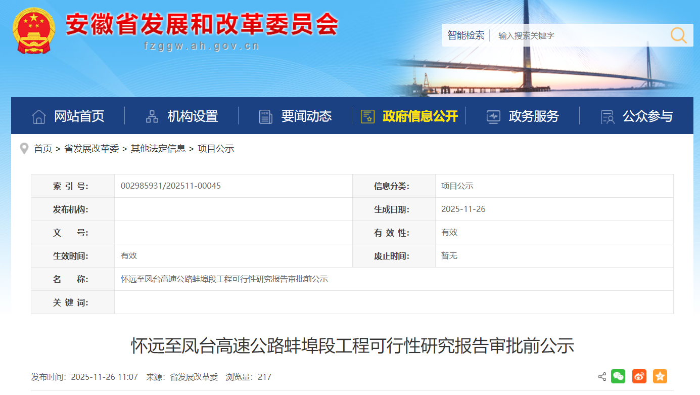 现将怀远至凤台高速公路蚌埠段工程可行性研究报告审批内容予以公示。公示时间自公示之日起10个工作日(11月26日—12月9日),如有意见和建议,请向省发展改革委基础设施发展处反映。反映以来人或署名来信(包括电子信函)方式,并提供姓名及联系电话,对匿名方式提出异议的不予受理。