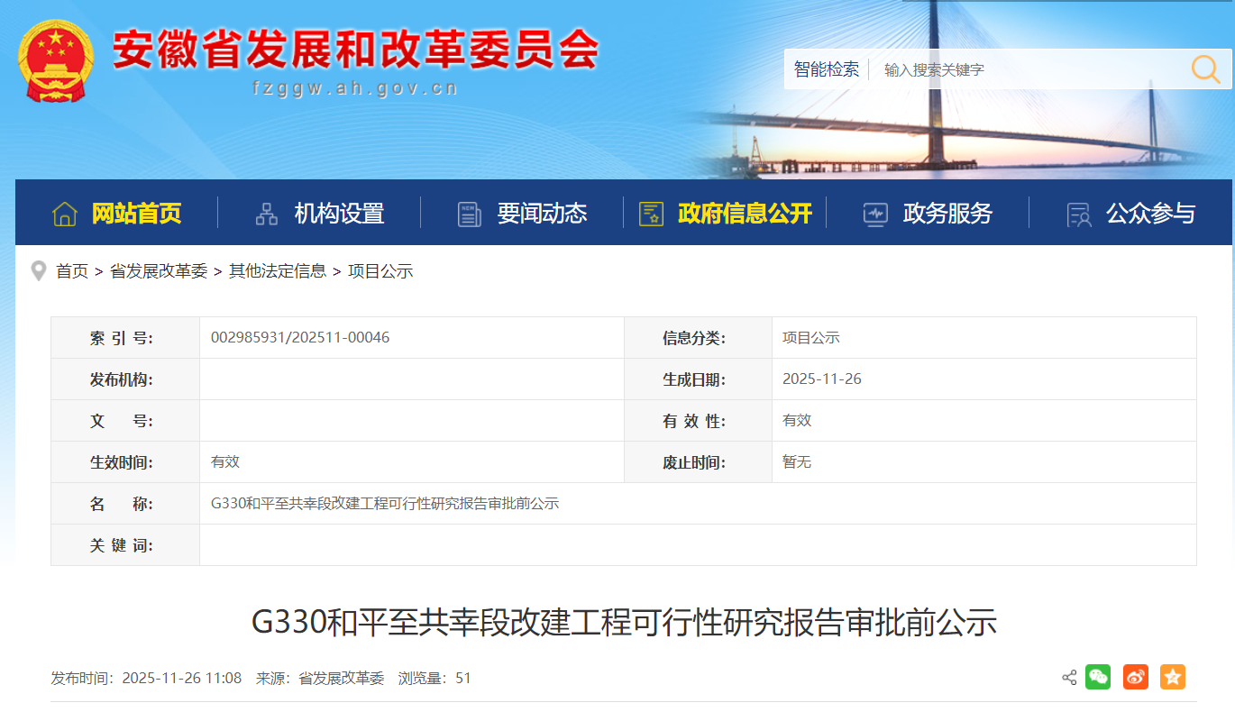 现将G330和平至共幸段改建工程可行性研究报告审批内容予以公示。公示时间自公示之日起10个工作日(11月26日—12月9日),如有意见和建议,请以来人或署名来信(包括电子信函)方式向省发展改革委基础设施发展处反映,并提供姓名及联系电话,对匿名方式提出异议的不予受理。