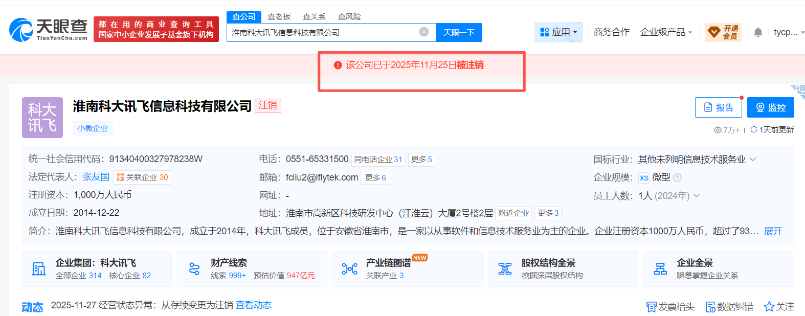 天眼查工商信息显示,近日,淮南科大讯飞信息科技有限公司登记状态由存续变更为注销。淮南科大讯飞信息科技有限公司成立于2014年12月,法定代表人为张友国,注册资本1000万人民币,经营范围包括智慧城市技术研究、体系建设、产品研发、工程建设、运营服务等。