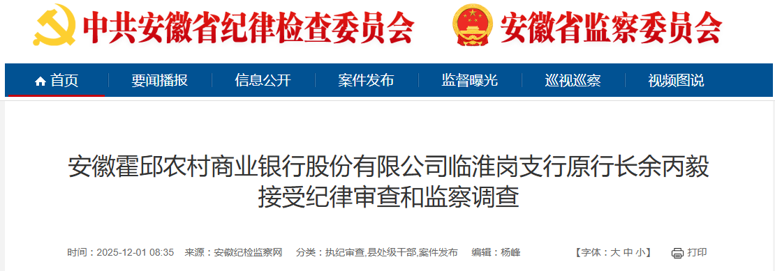安徽霍邱农村商业银行股份有限公司临淮岗支行原行长余丙毅涉嫌严重违纪违法,目前正接受安徽省纪委监委驻省农信社纪检监察组纪律审查和六安市霍邱县监察委员会监察调查。(安徽省纪委监委驻省农信社纪检监察组、六安市霍邱县纪委监委)
