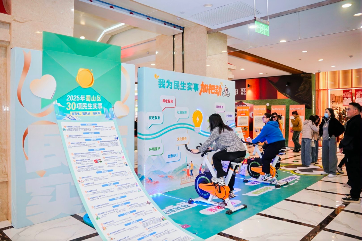 互动体验区的骑行装置独具匠心,参与者通过骑行发电点亮“民生实事图景”,在趣味互动中深化对民生工作的认知;政策宣讲区通过图文展示和“民生政策讲解员”面对面答疑,配合宣传手册发放,让30项民生实事举措直观可感;抽奖区则与蜀山区民生实事线上活动“民生心选择”民意评价联动,以“线上+线下”的抽奖互动形式,充分调动居民参与热情,实现民生反馈与互动体验的双向赋能。