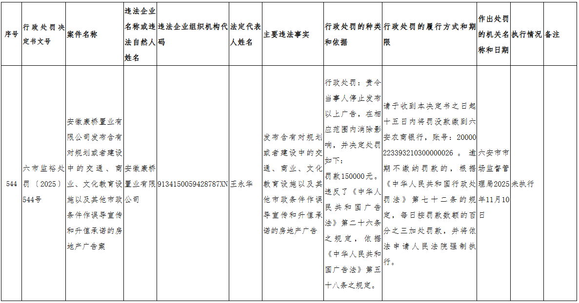 据裕安区市场监管局处罚信息显示,因发布含有对规划或者建设中的交通、商业、文化教育设施以及其他市政条件作误导宣传和升值承诺的房地产广告,安徽康桥置业有限公司被罚15万元。行政处罚决定书文号是六市监裕处罚〔2025〕544号。