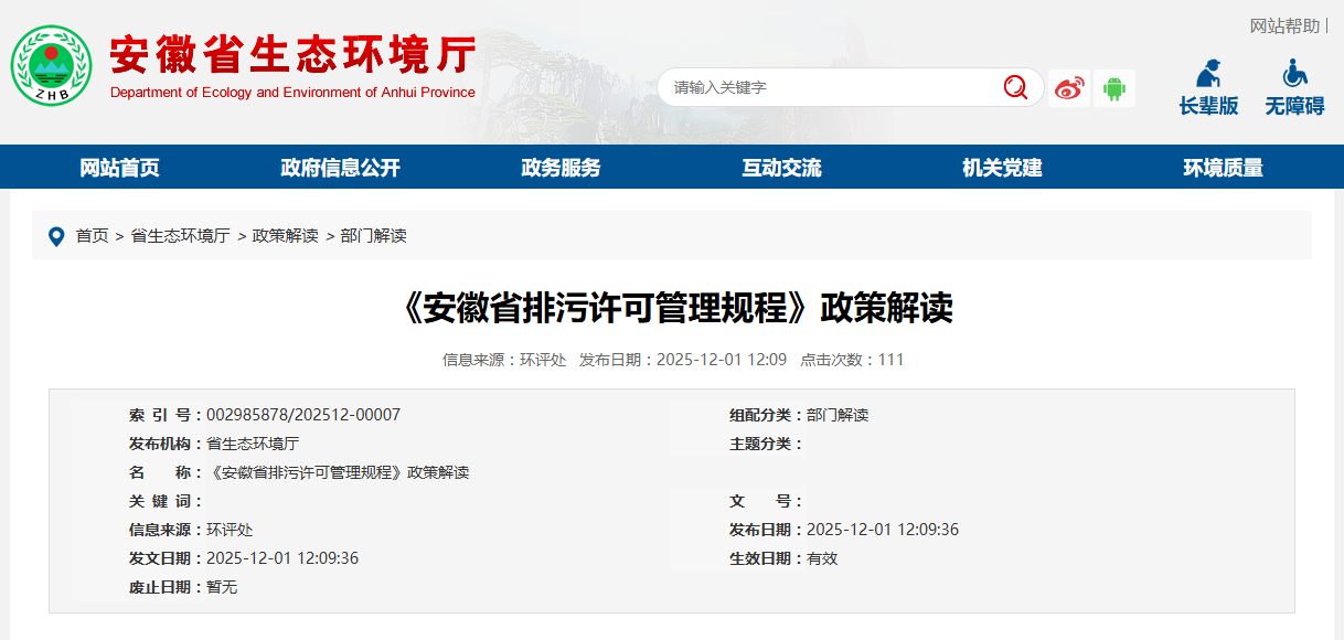 为深入贯彻落实党的二十大、二十届三中全会精神,全面落实省委十一届七次全会要求,落实以排污许可制为核心的固定污染源监管制度,推进美丽安徽建设,服务高质量发展,我厅对2019年印发的《安徽省固定污染源排污许可证核发工作规程(试行)》进行了修订,形成《安徽省排污许可管理规程》,经第13次厅长办公会审议后于2025年11月24日印发。
