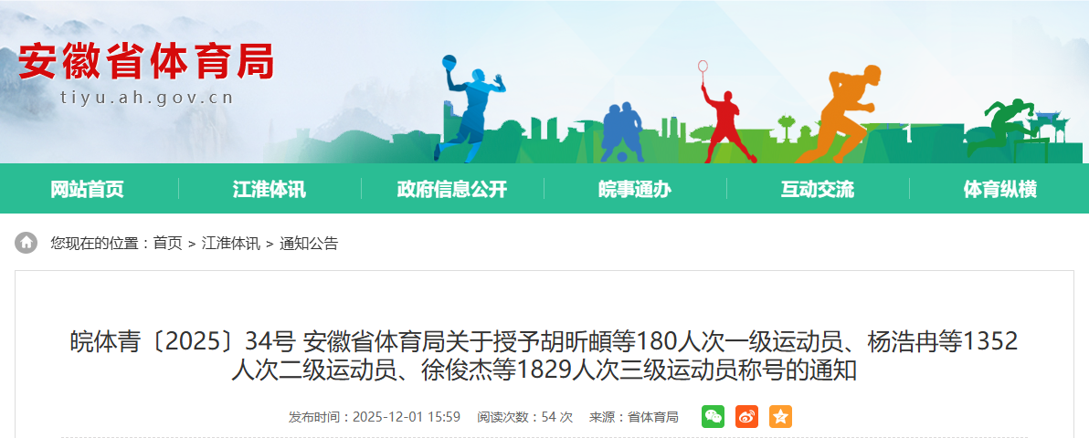12月1日,据“安徽省体育局”公开信息显示,安徽省体育局发布皖体青〔2025〕34号安徽省体育局关于授予胡昕頔等180人次一级运动员、杨浩冉等1352人次二级运动员、徐俊杰等1829人次三级运动员称号的通知。名单如下: