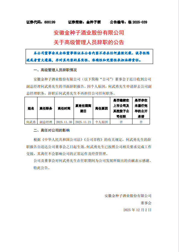 12月2日,安徽金种子酒业股份有限公司发布关于高级管理人员辞职的公告。安徽金种子酒业股份有限公司董事会于近日收到公司副总经理何武勇先生的书面辞职报告。因个人原因,何武勇先生申请辞去公司副总经理职务,辞职后何武勇先生不再担任公司任何职务。
