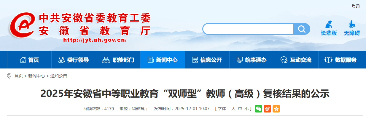 公示期为2025年12月1日-12月5日。公示期间,若对人选有异议,请通过来信、来电、来访等形式向省中等职业教育“双师型”教师认定指导中心反映。联系地址:合肥市双凤经济开发区金宁路北16号(安徽工商职业学院)综合楼1101室;联系电话:0551-65658583。