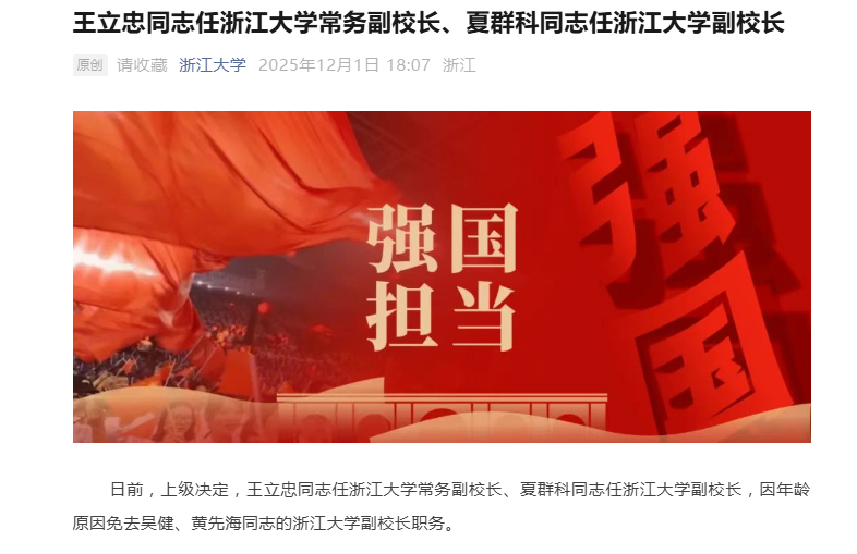 12月1日,浙江大学发布消息,王立忠任浙江大学常务副校长、夏群科任浙江大学副校长。其中,夏群科曾在中国科学技术大学地空学院获得博士学位。