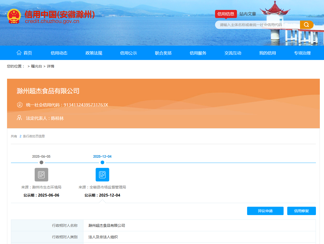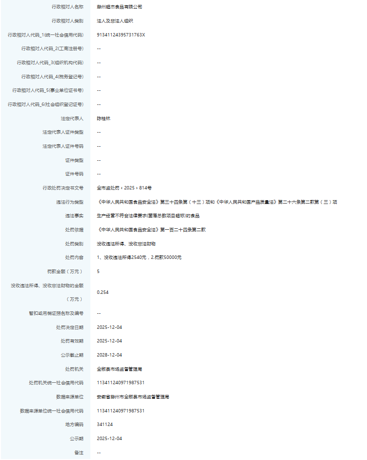 据“信用滁州”公开披露行政处罚信息,因生产经营不符合法律要求(菌落总数项目超标)的食品,滁州超杰食品有限公司被罚没5.254万元。行政处罚决定书文号是全市监处罚﹝2025﹞814号。