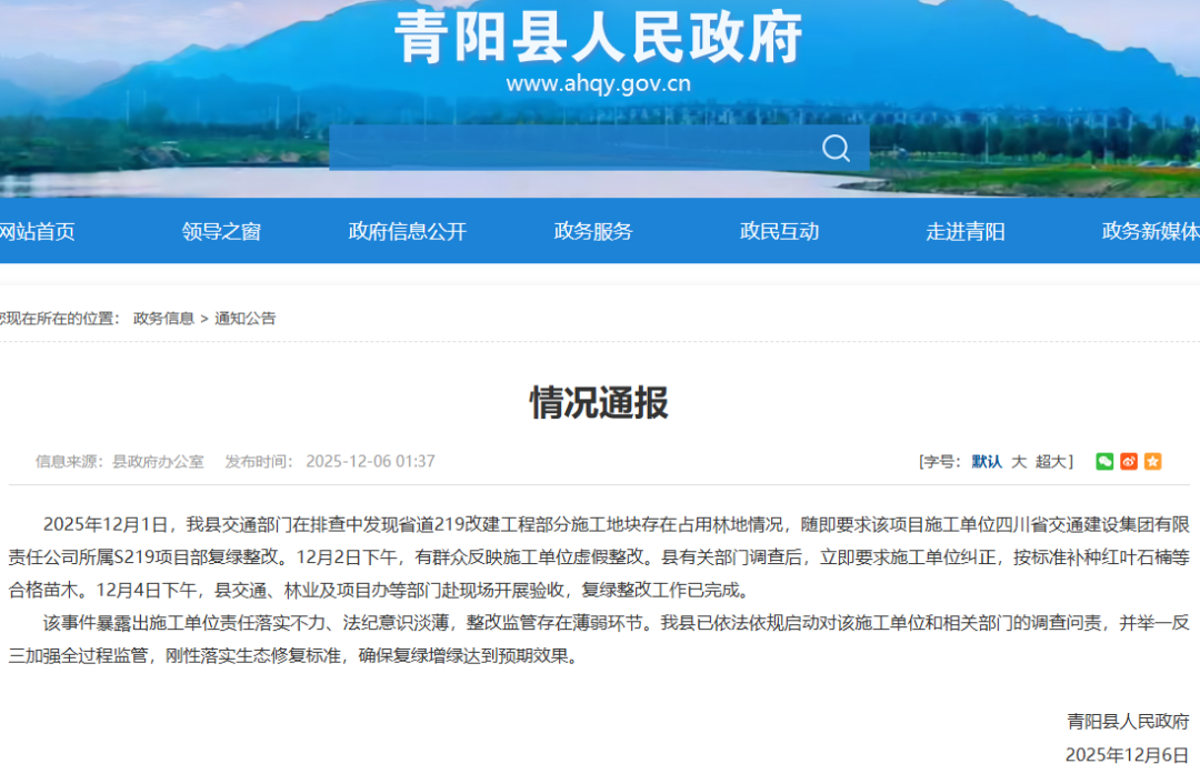 12月6日,青阳县人民政府网站发布“情况通报”,详情如下: