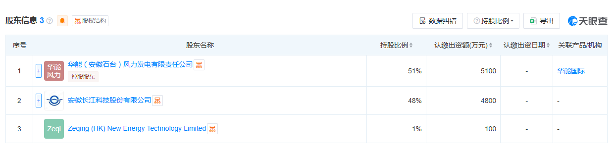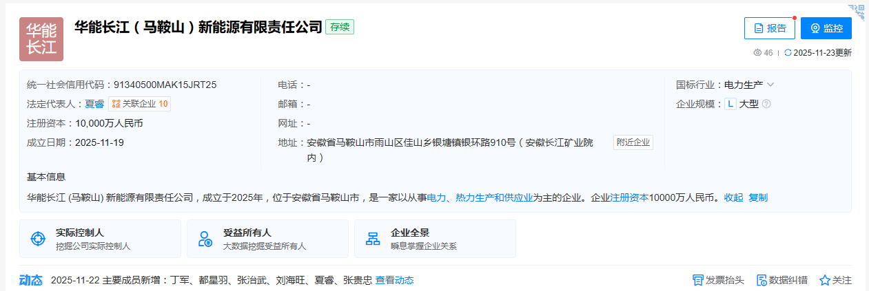 近日,华能长江(马鞍山)新能源有限责任公司成立,法定代表人为夏睿,注册资本为1亿元,该公司由华能国际全资子公司华能(安徽石台)风力发电有限责任公司、安徽长江科技股份有限公司等共同持股。经营范围包含:发电技术服务;太阳能发电技术服务;风力发电技术服务;合同能源管理;储能技术服务等。